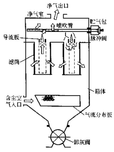 主要由进风管、排风管、箱体、灰斗、清灰装置、导流装置、气流分流分布板、滤筒及电控装置组成。滤筒在除尘器中可垂直或倾斜布置,垂直布置清灰效果更好,花板下部为过滤室,上部为气箱脉冲室。